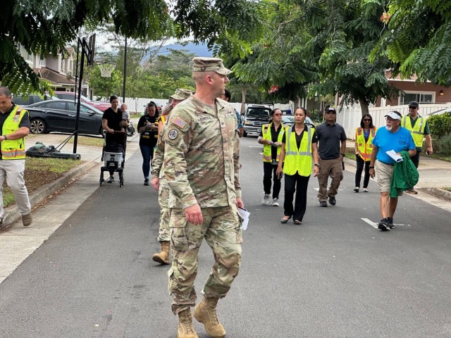 SCHOFIELD BARRACKS, Hawai’i — In an unprecedented move to bolster community engagement and address on-base living concerns, U.S. Army Garrison Hawai’i conducted its first-ever “walking housing town hall” today at Schofield Barracks. The walk, led by Garrison leadership, took a proactive route from Kawika St. through various residential lanes, concluding at Lalauiku Way.