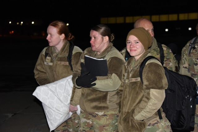 Senior Airmen Emma Oehler, 185th Air Refueling Wing medical technician, waits to depart the Sioux City, Iowa, airport with Airmen from the Iowa Air National Guard’s 185th Air Refueling Wing Medical Group Jan. 15, 2025. Iowa Air Guard medical technicians are flying to Washington to provide medical support for National Guard members in the capital region as part of the 60th Presidential Inauguration. U.S. Air National Guard photo Senior Master Sgt. Vincent De Groot