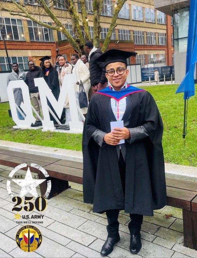 Femi Sopein, a general supply specialist at Logistics Readiness Center Stuttgart, walked the stage at Queen Mary University of London in London, England, and received his master’s degree in international relations, Jan. 6. As the Army celebrates its 250th birthday this year, Sopein said he’s proud to serve with an organization that cares about its people and provides them with opportunities to set goals, grow and succeed.