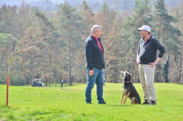 Dusty Rhodes (from left), his dog Buckeye and Gerry Beierschmitt discuss maintenance issues at the Rheinblick Golf Course.