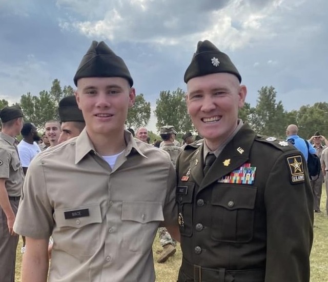 Pfc. Thor Mace (left) poses for a photo with his uncle Lt. Col. Matthew Mace during Thor’s rigger school graduation at Fort Gregg-Adams, VA.