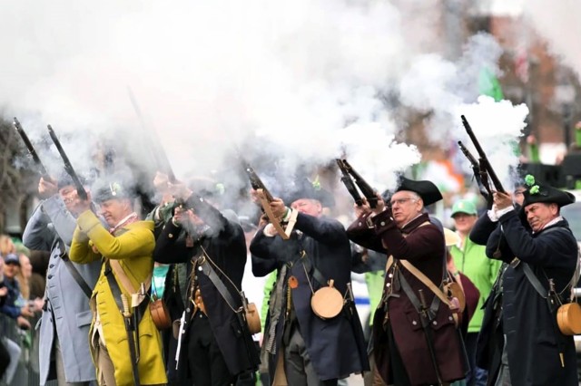 The Lexington Militia Men perform a musket firing demonstration during Boston’s St. Patrick’s Day parade March 16, 2025 (Photo by Joe Farrar).