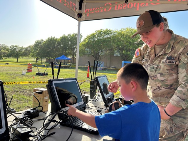 A standout moment of the day came during a robotics activity led by Pvt. Gretchen Fieldhouse, an explosive ordnance disposal specialist, 752nd Ordnance Company (explosive ordnance disposal), 79th EOD Battalion, 71st EOD Group, 20th Chemical, Biological, Radiological, Nuclear, Explosives Command, where children took turns maneuvering a Man Transportable Robotic System to pick up inert training grenades.