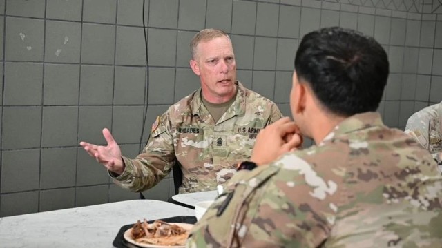 FORT CAVAZOS, Texas — Command Sgt. Maj. Loyd Rhoades, U.S. Army Garrison-Fort Cavazos command sergeant major, joined Soldiers for lunch April 3 at the Theodore Roosevelt Dining Facility here to listen to their questions and concerns as part of a new monthly initiative, Meet Your Garrison Command Sergeant Major.