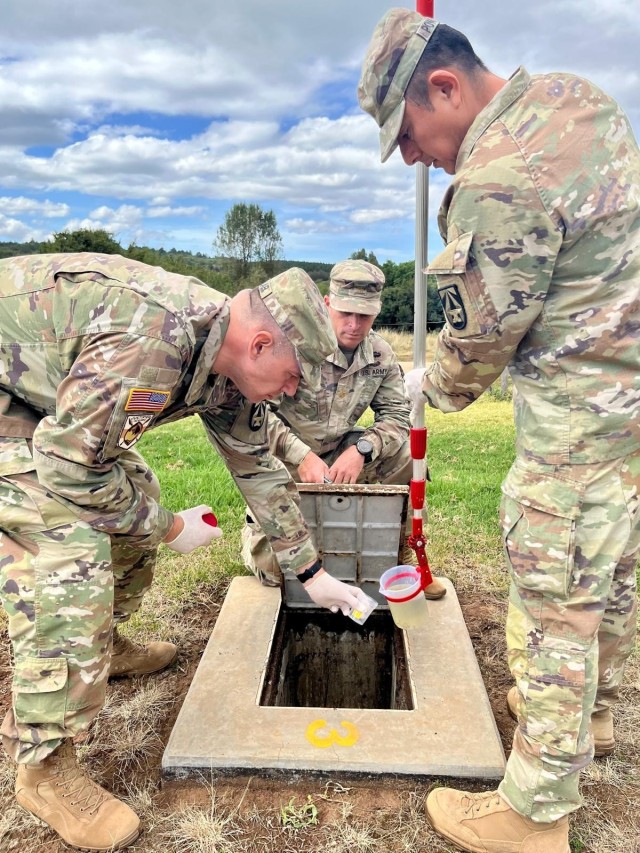 From left to right: Col. Gerald Kellar, Maj. John Eads, and Maj. Luis Pow Sang collect waste water from sewers at the Counter Insurgency, Terrorism, and Stability Operations Center during Exercise Justified Accord.