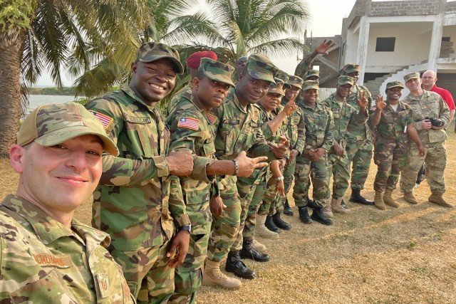 U.S. Air Force Tech. Sgt. Drew Schumann, a public affairs specialist with the 127th Wing, Michigan Air National Guard, poses with members of Armed Forces Liberia, Staff Sgt. Matthew Kakaris, broadcaster from Armed Forces Network Europe, Sembach, Germany, and Maj. Joe Legros, a public affairs officer from U.S. Army Southern European Task Force, Africa, Vicenza, Italy, following a public affairs workshop in Monrovia, Liberia, Jan. 23, 2025. Organized by U.S. Army Southern European Task Force, Africa (SETAF-AF), and as part of the State Partnership Program (SPP), three U.S. public affairs specialists took part in a military-to-military PA workshop from Jan. 19-24, 2025, bringing together a diverse team from across the military public affairs domain. (U.S. Air National Guard photo by Tech. Sgt. Drew Schumann)
