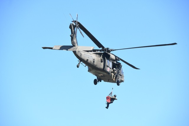 During the training, the Soldiers flew hoist-equipped UH-60 Black Hawk helicopters while the MD-HART members aided simulated victims on the ground before they were hoisted to the aircraft.