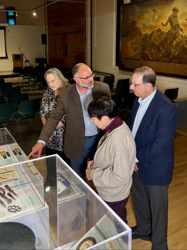New York State Military Museum Director Courtney Burns, second from left, discusses artifacts with the Marowitz family members, from left, Linda, Roberta and Larry, during the museum unveiling of a new temporary exhibit for the display of “Hitler’s Hat,” once worn by the Reich Chancellor prior to the Second World War. The hat, and other artifacts, were presented by the family of their father, Richard Marowitz, who was present at the Concentration Camp Dachau liberation with the 42nd Infantry Division and secured the Nazi clothing memorabilia the following day during his unit’s capture of Munich on April 30, 1945. (Photo Credit: Richard Goldenberg)