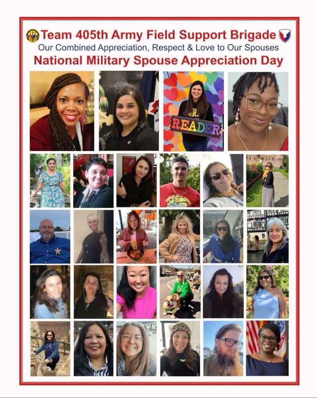 Caring for our spouses and families is a privilege and a responsibility, one the Army is committed to fully. The Army’s leadership expects a lot from everyone, and they ask a lot of our spouses and families. Therefore, the Army has a solemn obligation to take care of them. On National Military Spouse Appreciation Day, the 405th AFSB acknowledges the spouses of our Soldiers, Army civilians, host nation Army employees and contractors.