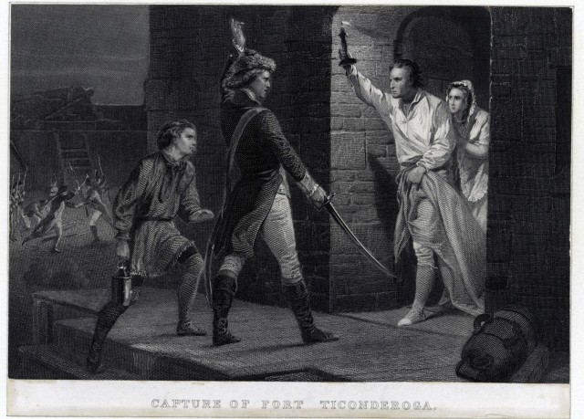 The Capture of Fort Ticonderoga, New York, depicts Ethan Allen and Colonel Benedict Arnold overcoming a British garrison during the Revolutionary War.