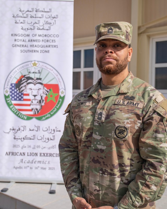 U.S. Army Master Sgt. Preston Lewis, assigned to U.S. Army Southern European Task Force, Africa (SETAF-AF), poses for a photo during African Lion 2025 (AL25) at Agadir, Morocco, May 8, 2025. African Lion 25 (AL25), the largest annual military exercise in Africa, brings together over 50 nations, including seven NATO allies and 10,000 troops to conduct realistic, dynamic and collaborative training in an austere environment that intersects multiple geographic and functional combatant commands. Led by U.S. Army Southern European Task Force, Africa (SETAF-AF) on behalf of the U.S. Africa Command, AL25 takes place from April 14 to May 23, 2025, across Ghana, Morocco, Senegal, and Tunisia. This large-scale exercise will enhance our ability to work together in complex, multi-domain operations—preparing forces to deploy, fight and win. (U.S. Army photo by Sgt. 1st Class Andrew Mallett)