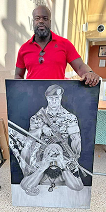 Just a few years ago, his wife Natalie―also an Army Veteran―discovered his artwork from high school while searching for documents. When she asked if he was an artist, he said, “I used to draw.” She responded, “You are an artist. It is a God-given gift and not using the gifts God gave you is like a slap in the face.” A month later, when he returned home from work, Natalie had purchased canvases, paint, charcoal and other art supplies.