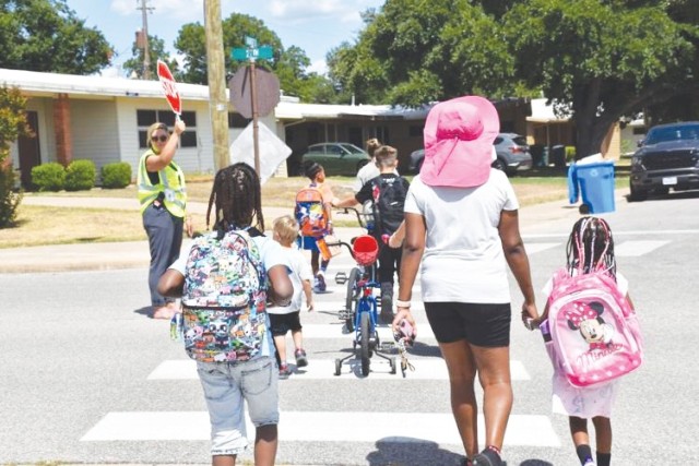 Children and parents guided by a crossing guard use the crosswalk across from Meadows Elementary School the first day of school Aug. 14, 2024, at Fort Cavazos, Texas. Walking instead of running helps to ensure pedestrians cross safely.