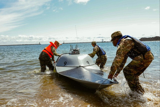 U.S. Army Soldiers assigned to the Multi-Domain Effects Battalion, 2nd Multi-Domain Task Force, retrieve an Unmanned Surface Vessel (USVs) from the water during Arcane Thunder 25, 16 May, 2025. Exercise Arcane Thunder 25 is a collaborative U.S. Army Europe directed, 2nd Multi-Domain Task Force led exercise designed to leverage the robust warfighting capabilities of the U.S., Allies, and partner nations to reach a precise, lethal end point. (U.S. Army photo by Spc. Jennifer Posy)