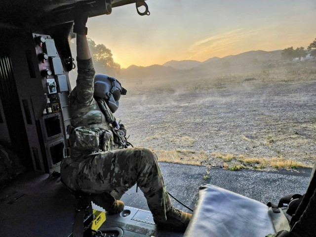 U.S. Army Reserve Spc. Shavaun Brugger, a UH-60 helicopter repairer assigned to Charlie Company, 7th Battalion, 158th Aviation Regiment, peers out of the door of a Black Hawk during Mojave Falcon 2025 at Fort Hunter Liggett, California, June 8, 2025. Mojave Falcon 2025 is a multi-faceted first-of-its-kind Army Reserve training exercise that integrates Combat Support Training Exercise (CSTX), Global Medic, Quartermaster Liquid Logistics Exercise (QLLEX), Port Operations and Nationwide Move.