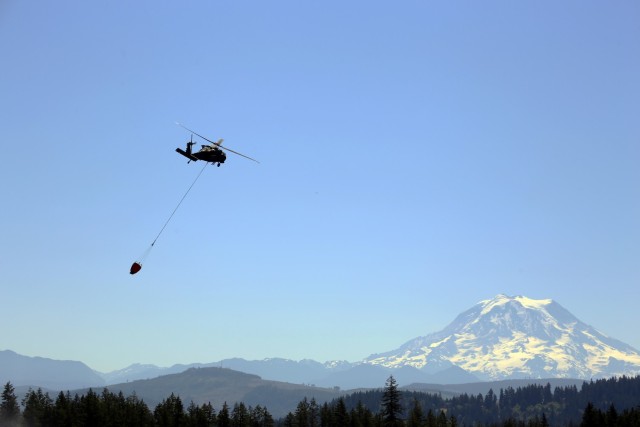 Guard members from the 96th Aviation Troop Command partnered with Central Pierce Fire and Rescue to conduct water bucket training June 30 near Puyallup.