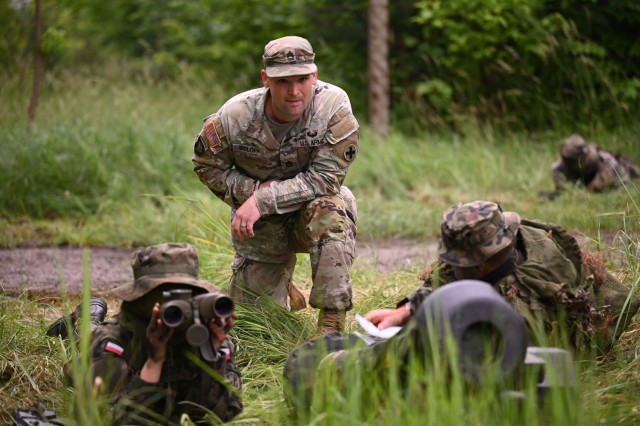 U.S. Army Sgt. 1st Class Benjamin Soloff, an infantryman with Charlie Company, 1st Brigade, 178th Infantry Regiment, Illinois Army National Guard, observes Polish Territorial Defence soldiers as they prepare range cards necessary for Javelin deployment during Javelin anti-armor ambush training at the TDF Training Center in Toruń, Poland, June 11, 2025. The Illinois National Guard and Poland are partners in the Department of Defense National Guard State Partnership Program, which pairs Guard elements with partner nations worldwide for mutual training and subject matter expert exchanges. Servicemembers with the 33rd Infantry Brigade Combat Team spent two weeks alongside their Polish counterparts training on sniper operations, the Javelin anti-tank weapon system, combat medical care, and remote observer techniques. (U.S. Army National Guard photo by Staff Sgt. Amber Peck)