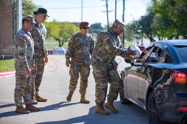 FORT CAVAZOS, Texas — Hundreds of cars lined up Nov. 15 in the Main Post Chapel parking lot here to receive Thanksgiving meal baskets where eager volunteers waited to greet them.