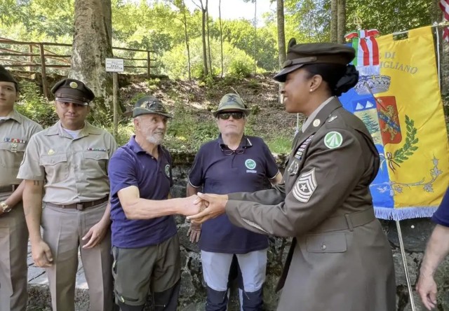 The ceremony, held in Pian di Novello, in Pistoia province, commemorated the lives of troops who gave everything to liberate Italy from fascist occupation. Sgt. Major Tameka Horne, Sgt. First Class Victor Benavides, Sgt. Alan Bayot with the 839th Transportation Battalion, and Spc. Daniel Perez, 529th MP Company attended the ceremony representing the U.S. Military. Horne delivered a powerful speech on behalf of the U.S. military community at Camp Darby.
