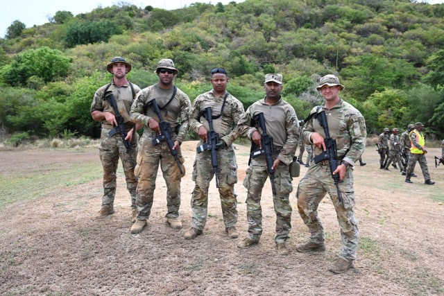 Soldiers from the D.C. National Guard, Barbados Defence Force Reserves, Jamaica Defence Force, and Jamaica National Reserve stand for a photograph at Twickenham Park Range in St. Catherine, Jamaica, on July 17, 2025. As part of the Caribbean Regional Training Camp, activities included zeroing, firing from different positions, march-and-shoot practice, and a march-and-shoot competition. The District of Columbia National Guard’s (DCNG) partnership with Jamaica, facilitated by the U.S. National Guard Bureau’s State Partnership Program (SPP), promotes security cooperation through military engagements and interagency collaboration. (Photo Credit: U.S. Air Force photo by Senior Master Sgt. Jason M. Melton)