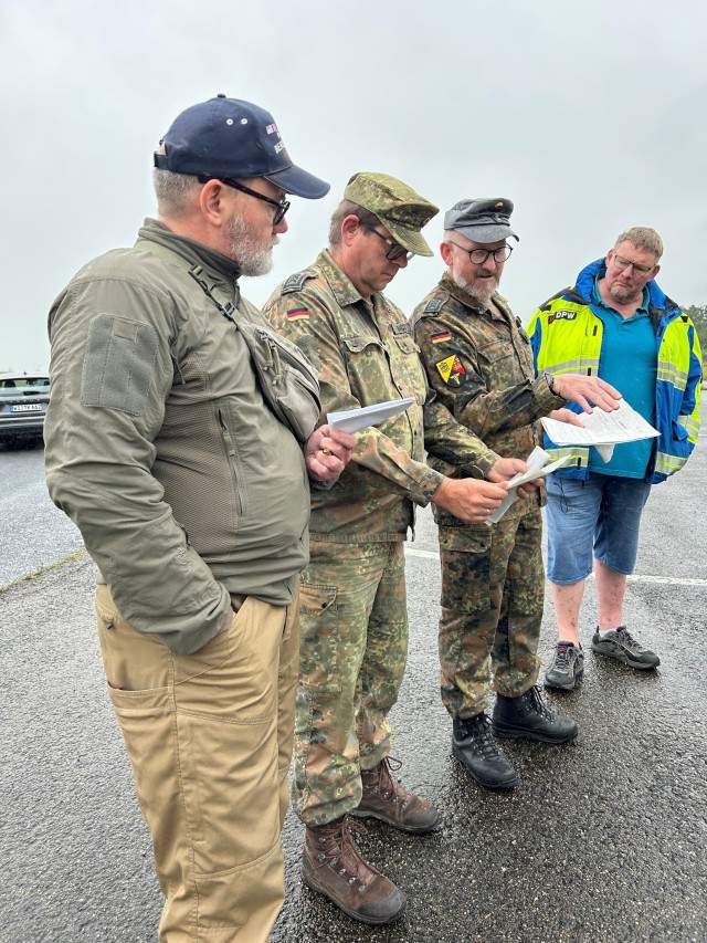 ILLESHEIM, Germany – Representatives of Installation Management Command – Europe, a Bundeswehr inspection team and Directorate of Public Works personnel compare maps on record with actual infrastructure on location at Storck Barracks during a protection area inspection Aug. 4, 2025.