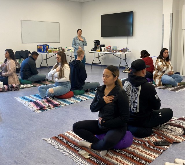 Couples practiced yoga during a Love and Money Matters workshop at Army Community Service Vicenza Nov. 17, 2023.