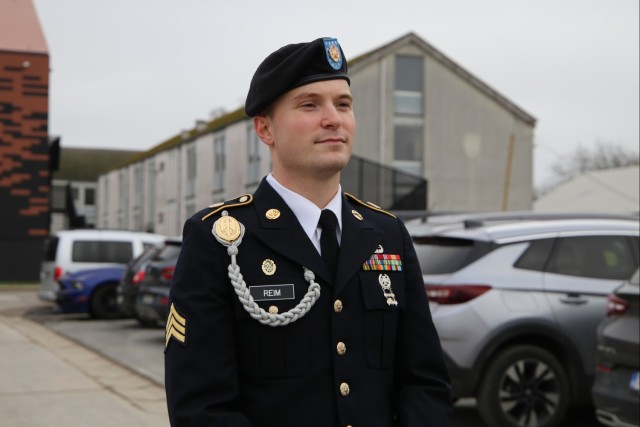 Sgt. Christian Reim in Bastogne, Belgium, Dec. 16, 2023. Reim was the leader of the color guard during the parade through town as part of the city’s commemoration of the 79th anniversary of the Battle of the Bulge. (U.S. photo by Libby Weiler, USAG Benelux Public Affairs)