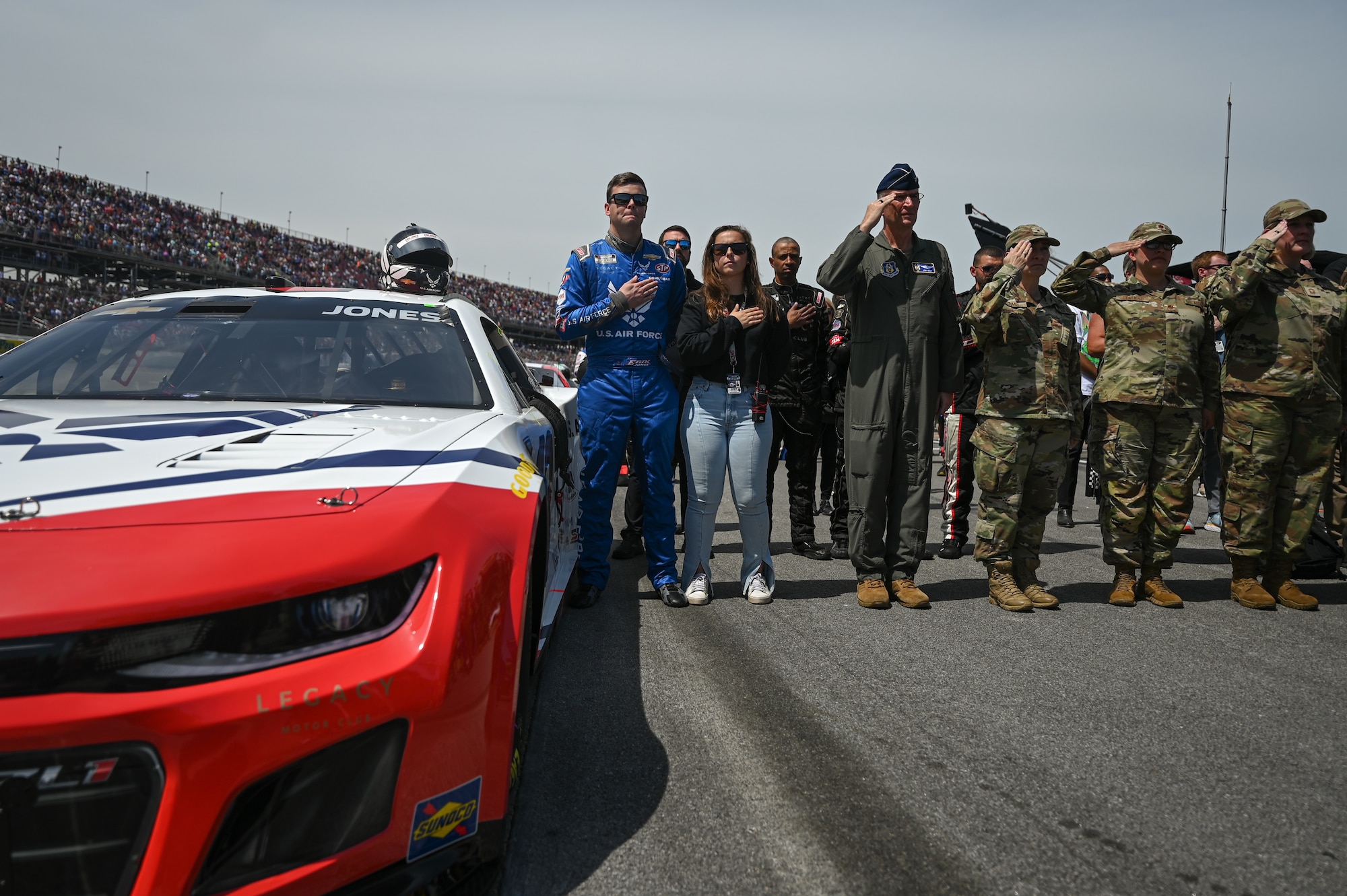 “It’s been an honor to represent the U.S. Air Force the last few years,” Jones said before the race. “My grandfather served, so I have a personal connection to them. To have Lt. Gen. Healy at the track with us this weekend is really special. We were so close to a win at Talladega in the fall, I would really like a chance to be there at the end and score a win for them to celebrate the 75th anniversary of the Air Force Reserve.”
