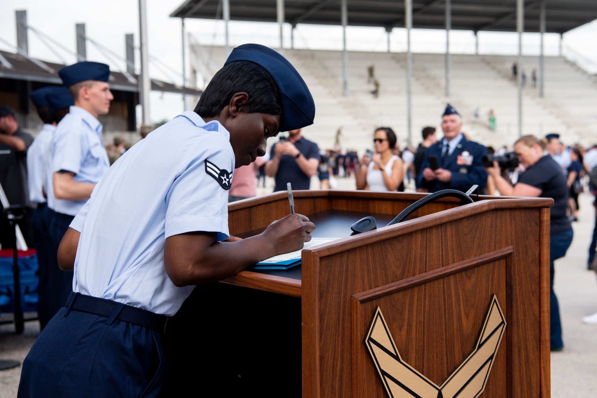 “Their desire to become citizens exemplifies their commitment and dedication to the United States,” said Col. John P. O’Dell, 37th Training Wing vice commander. “When we began the partnership with USCIS, we asked all trainees who would be interested in starting their application, and 111 raised their hands. These trainees volunteered to serve a country they aren’t yet citizens of, and now we get to formally recognize them upon their graduation as American Airmen.”
