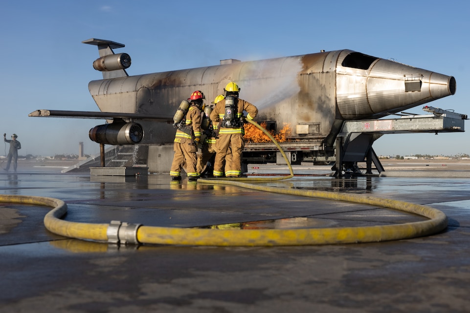 Practice how you play. It’s not every day that you see an aircraft fire, which is why Marines with Aircraft Rescue and Fire Fighting stationed at Marine Corps Air Station Yuma, Arizona, unwrapped their Mobile Aircraft Fire Training Device just in time for the holidays. On Dec. 21, 2023, ARFF Marines from Headquarters and Headquarters Squadron conducted their semi-annual training with a MAFTD to instill confidence while under pressure and maintain their ability to perform in any case they are needed, on or off the airfield.