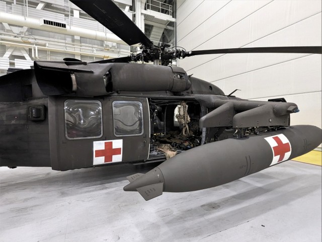 This UH-60 Black Hawk helicopter belonging to Charlie Company, 1-52 General Support Aviation Battalion, is parked in the hangar at Fort Wainwright after flying to Tok, Alaska, and back for an aeromedical evacuation. The Arctic Dustoff crew evacuated a patient from the village to the hospital in Fairbanks on New Year’s Eve. (Photo by Eve Baker, Fort Wainwright Public Affairs Office)