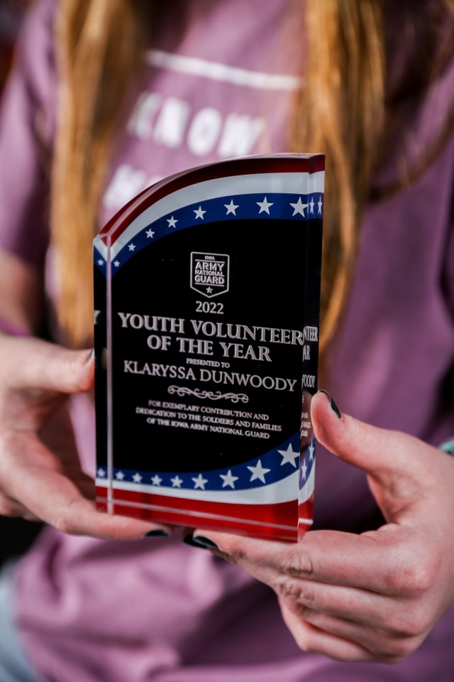 Klaryssa (Klair) Dunwoody, daughter of Capt. Josh Dunwoody, earned the Iowa Army National Guard Youth Volunteer of the Year for exemplary contribution and dedication to the Soldiers and families of the Iowa Army National Guard April 15, 2023.