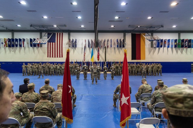 GRAFENWOEHR, Germany – At a Transfer of Authority ceremony, Task Force Thunder, 155th Armored Brigade Combat Team (ABCT), Mississippi Army National Guard, took command of the Joint Multinational Training Group-Ukraine (JMTG-U) mission under 7th Army Training Command (7ATC) from Task Force Bowie, 39th Infantry Brigade Combat Team (IBCT), Arkansas Army National Guard, on Jan. 5, 2024.