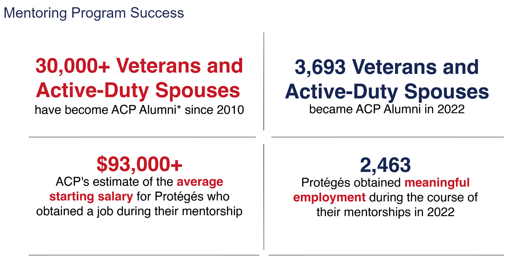 - ACP will introduce you to a mentor within several weeks of your application to the program and will check in throughout the year to provide customized resources and ensure positive outcomes. Ninety-eight percent of Veterans would recommend ACP.