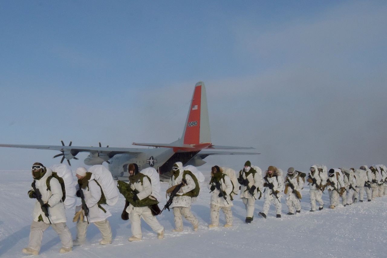 Dressed in white camouflage, soldiers established their security positions. They were equipped with individual weapons, machine guns and everything they needed to sustain themselves for up to three days in the Arctic.
