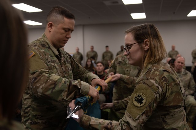 Capt. Richard Hughes and Sgt. Tianna Wilson, commander and noncommissioned officer in charge of the 161st Military History Detachment, respectively, case the unit guidon during the unit’s deployment ceremony at Clay National Guard Center, Marietta, Georgia, Jan. 7, 2024. The unit will head to the Middle East to collect the history of the U.S. Army Central Command in the area.