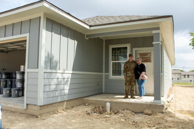 Spc. Grant Boshaw, 1st Cavalry Division, and his wife Allison stand outside of their new home. They will receive the keys in mid-June, and had the opportunity to walk through it April 20, 2023. (U.S. Army photo by Samantha Harms, Fort Hood Public Affairs)