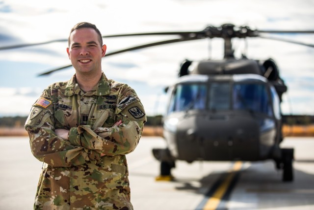 Capt. Brendan Meehan poses for a photo at the New Hampshire Army Aviation Support Facility in Concord, New Hampshire. Meehan was injured during an Iranian missile strike Jan. 8, 2020, in Al Asad Air Base, Iraq. After about two years of extensive treatment, the pilot is now flying again and commanding a unit.