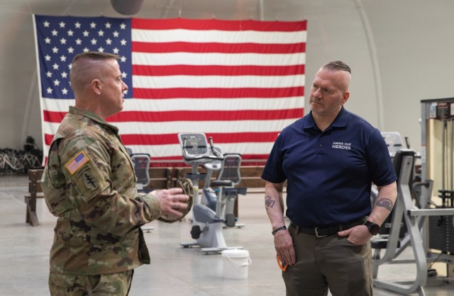 The former U.S. Army Senior Enlisted Advisor to the Chiefs of Staff, retired Sgt. Maj. John W. Troxell listens to Cody Ioerger, a physical therapist assistant working in the adaptive reconditioning program in the Soldier Recovery Unit, at Irwin Army Community Hospital on Fort Riley, Kansas, April 12, 2023. Troxell and Medal of Honor recipient retired Staff Sgt. Clinton Romesha met with Soldiers of the 1st Inf. Div. to discuss what it means to be an enlisted member of the U.S. Army and what makes the noncommissioned officer corps such an essential part of the Armed Forces. (U.S. Army photo by Spc. Charles Leitner) (Photo Credit: Spc. Charles Leitner)