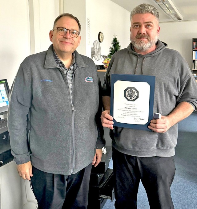 U.S. Army Garrison Wiesbaden Family and MWR Director Gregory Holzinger (left) recognizes Jeremy Tice for 25 years of service.