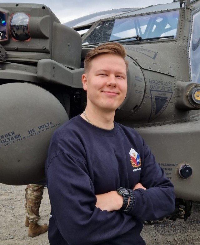 Raphael Scharf, a support operations transportation specialist at Army Field Support Battalion-Germany, poses for a photo in front of an AH-64 Apache helicopter. Scharf said at AFSBn-Germany, a strong emphasis on tackling the root causes and the effects of stress is important to the leadership and the entire team.