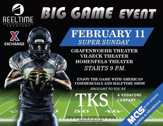 · The Grafenwoehr Exchange BIG GAME Event, Sunday, Feb. 11 at the Reeltime Theaters in Grafenwoehr, Vilseck and Hohenfels. Doors open at 9 p.m. The event is open and free to all ID-card holders 18 years or older. The game is brought to you by TKS with commercials and half-time show presented as well. All three theaters will be offering pizzas and wings for purchase as well as the Full Concessions kiosk is open for purchase (hotdogs, popcorn, nachos, adult beverage, sodas, bottled water, slushies, etc.) Grafenwoehr Pizza Hut will offer on-post home delivery & curbside pickup services available from 10 p.m. to 1 a.m. on 11 February.