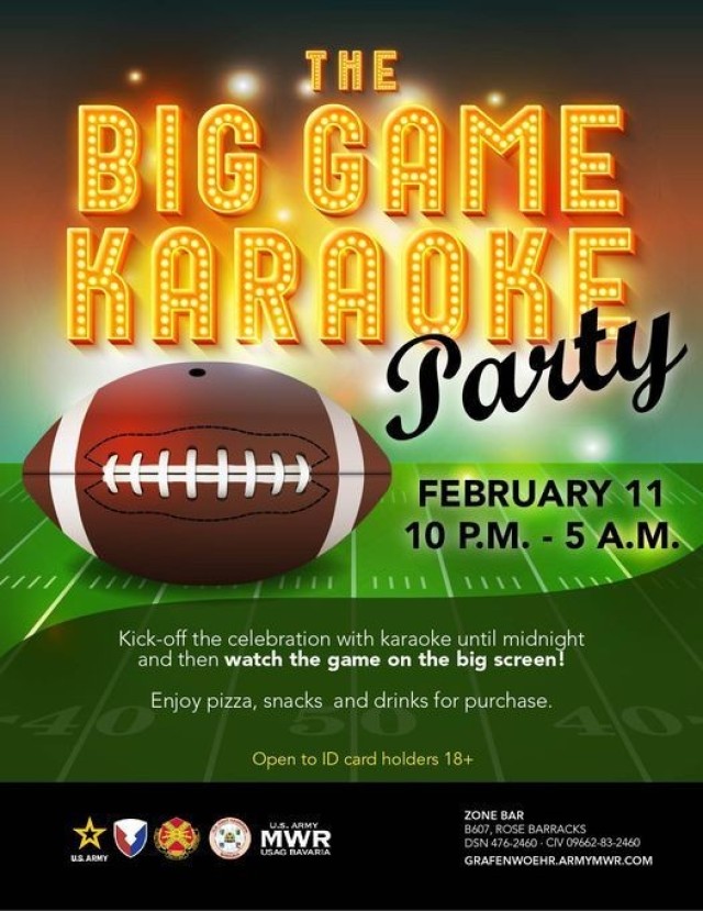 · Rose Barracks: The Big Game Karaoke Party, Feb. 11-12, 10 p.m.-5 a.m., Zone Bar, B607. Doors to the bar open at 10 p.m. and kick-off the celebration with a karaoke party until midnight. Show off your talent and get hyped up for the big game! Enjoy their popular flat bread pizzas and drinks for purchase. Open to ID card holders 18+.